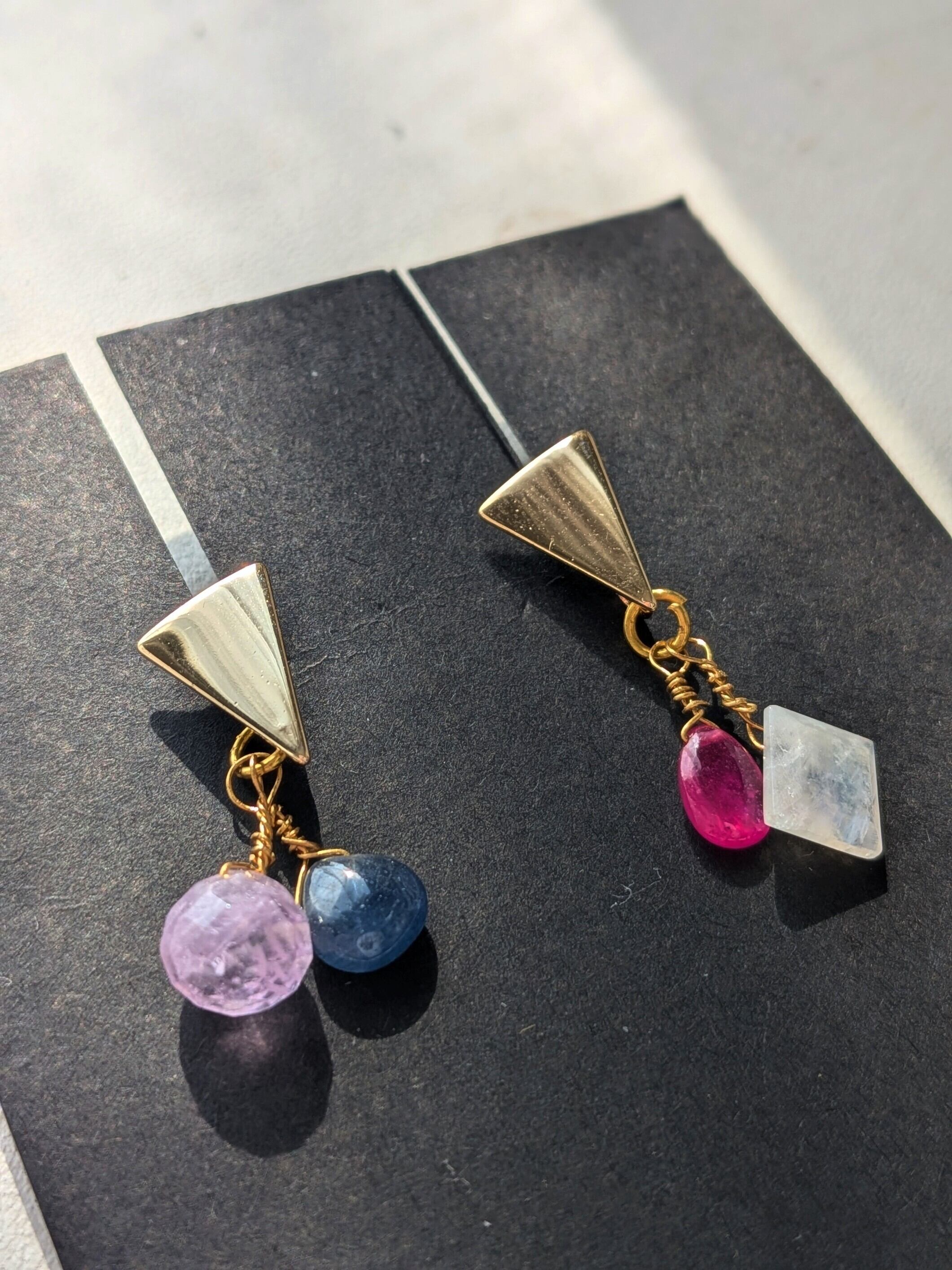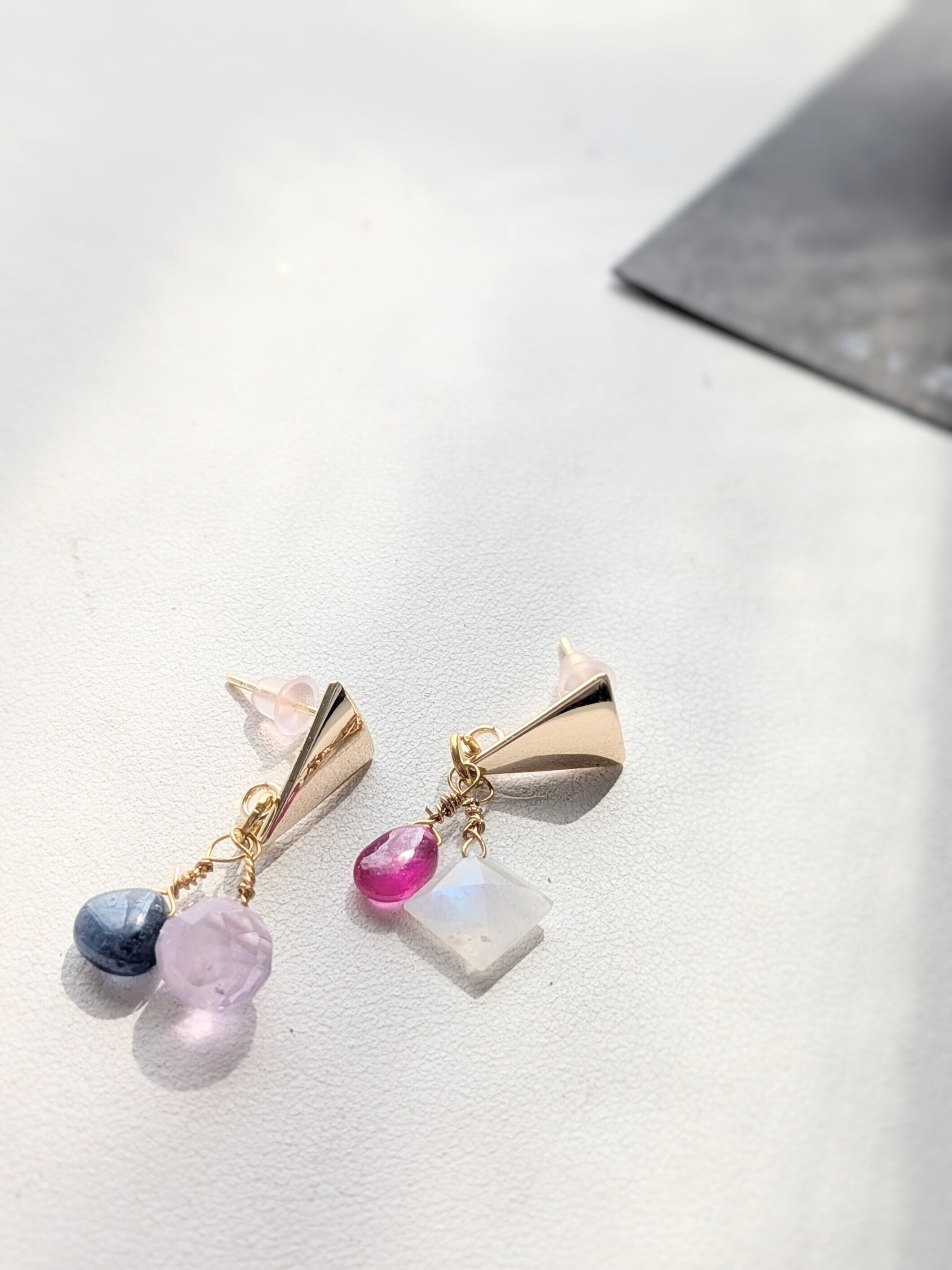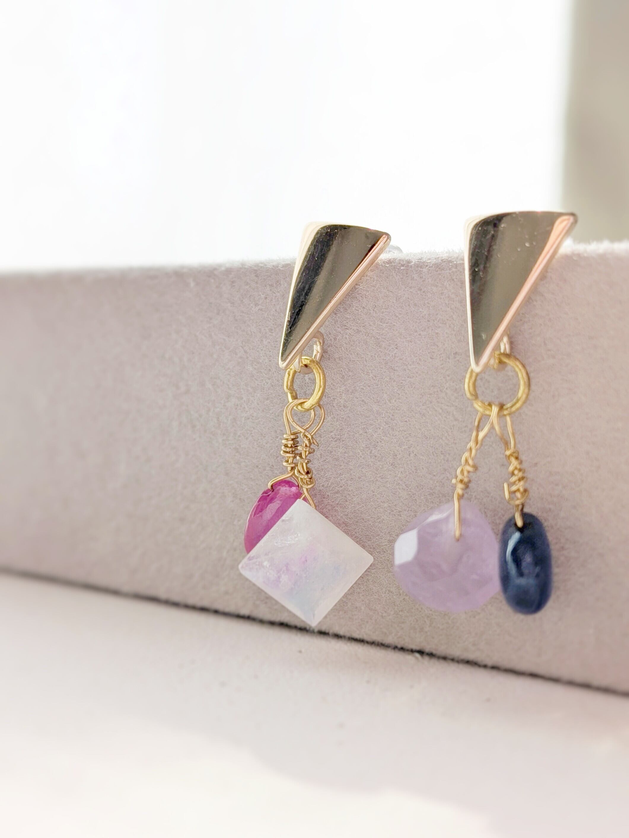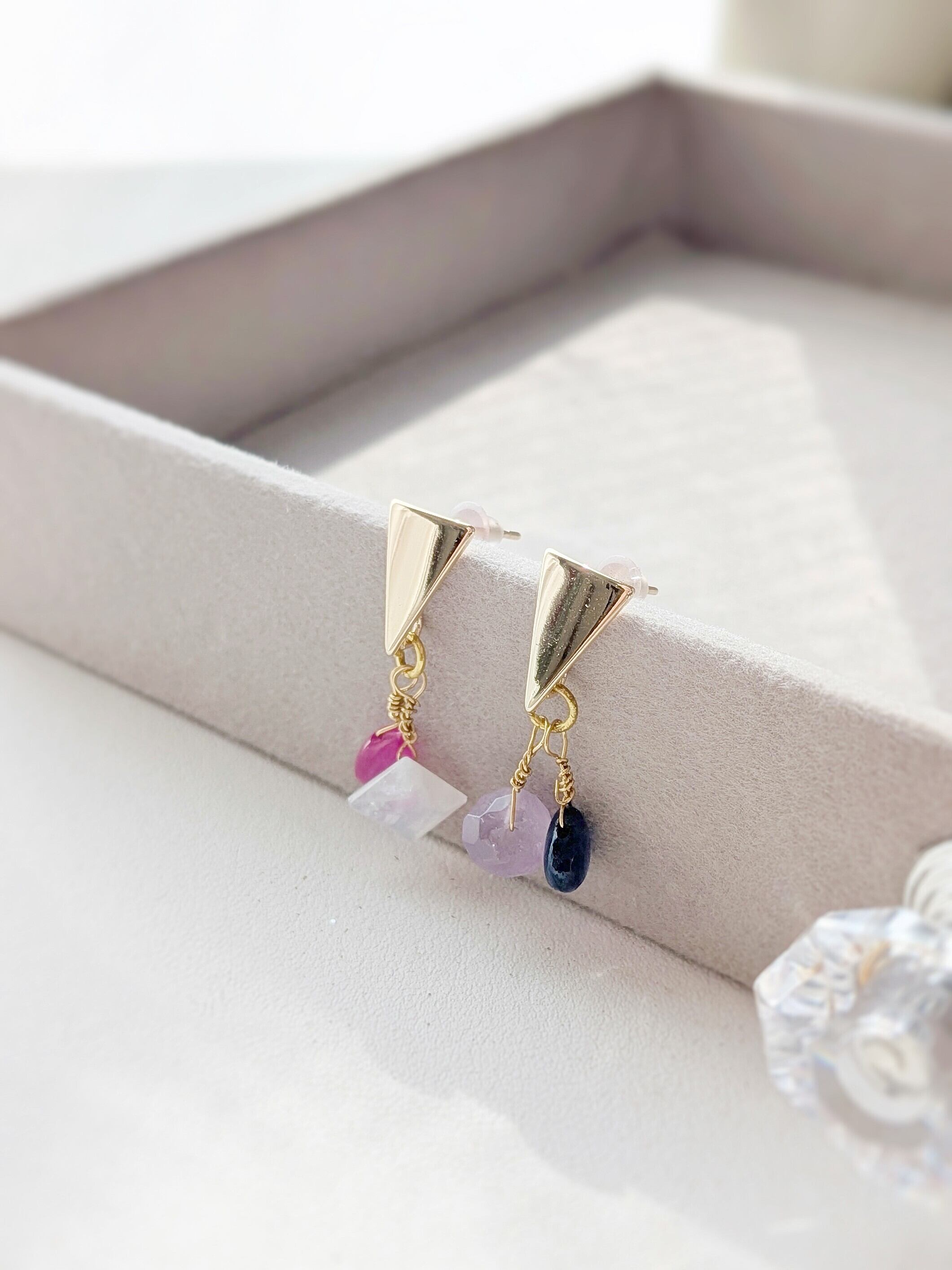 贈り物や自分へのご褒美にぴったりな「揺れるオリジナル宝石粒ピアス」です。シンプルでありながら、宝石の輝きが耳元で美しく揺れ動くデザインは、どんなシーンにもマッチします。大人の女性にふさわしい上品な印象で、普段使いから特別な日まで幅広く活躍するアイテムです。