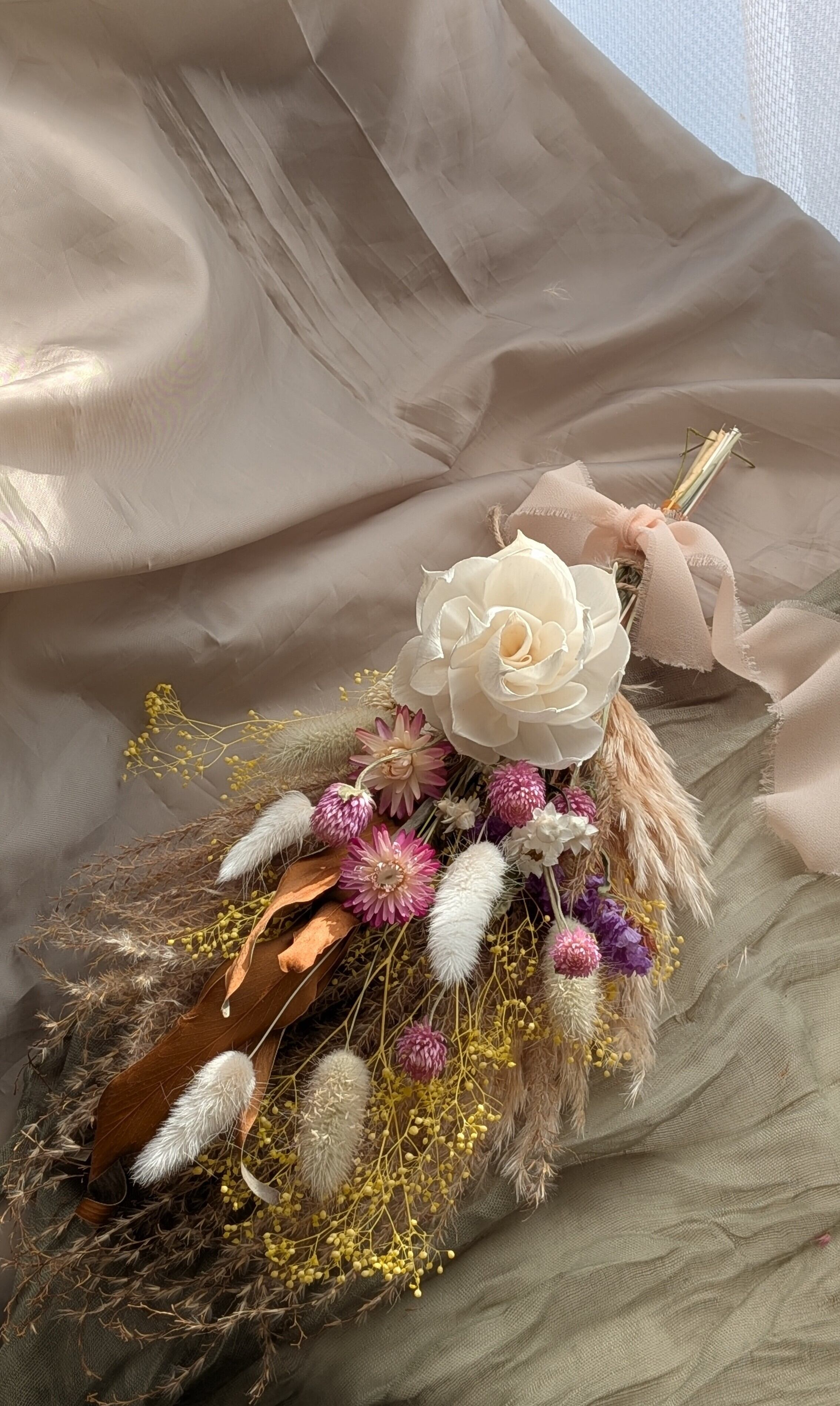 ○厳選されたドライフラワーを束ねたスワッグは、手作業で丁寧に仕上げられており、一つ一つ異なる表情をもたらします。色合いや質感が持つ自然な美しさは、どんなインテリアとも調和し、リラックスした雰囲気を演出します。