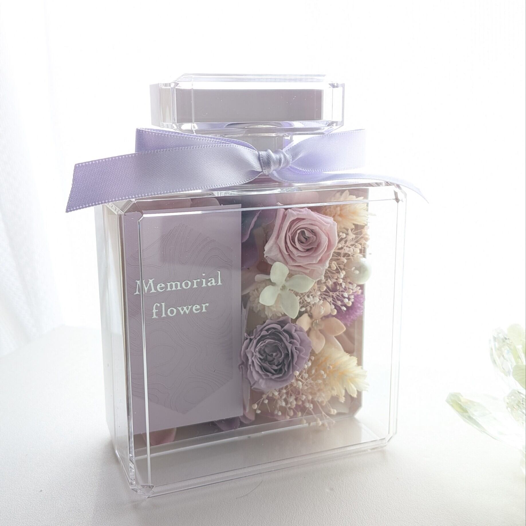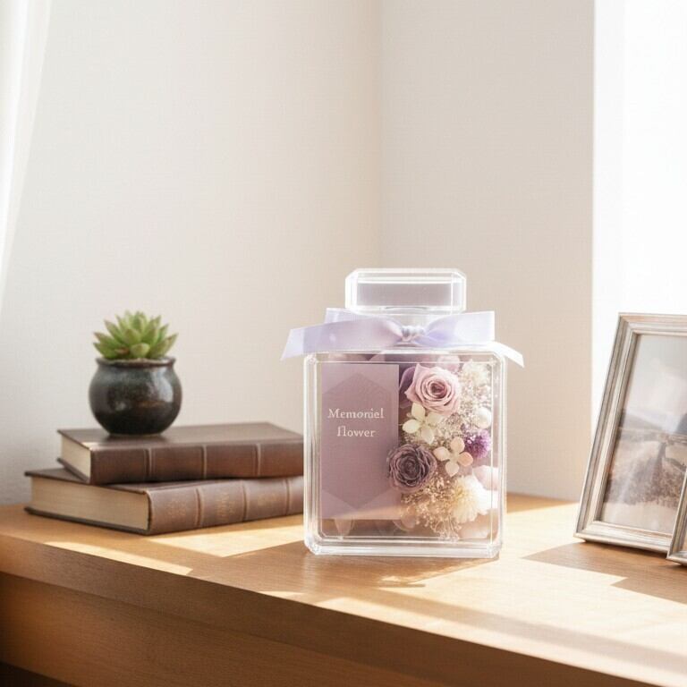 お供えやメモリアルギフトとして選ばれている、香水ボトル型のプリザーブドフラワーアレンジ。